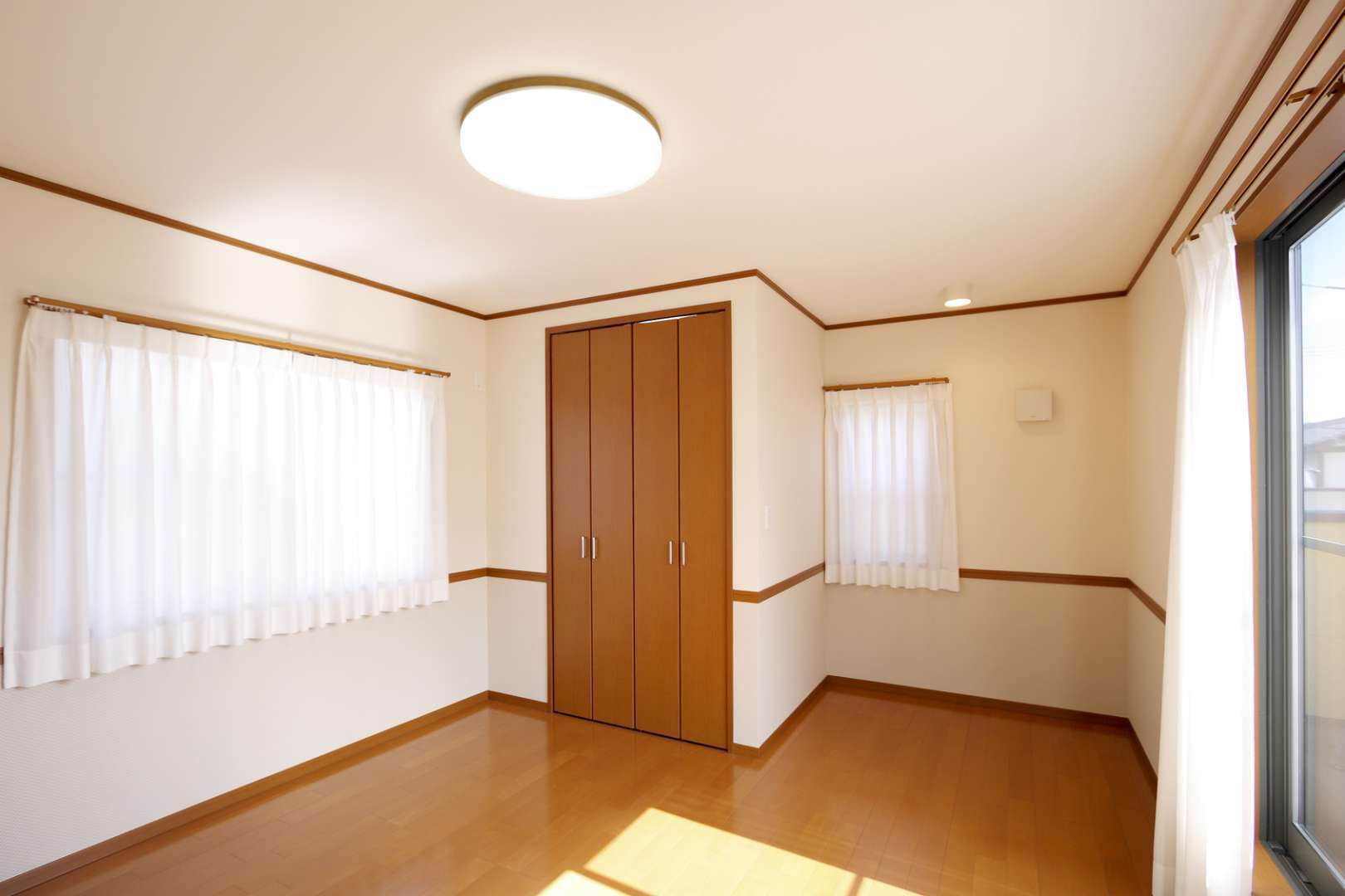 お子さんが小さい時期は、2階の個室を細かく区切らず、広々とした一つの大空間として使うのがおすすめです。走り回れる遊び場として使い、成長して個室が必要になったタイミングで壁や家具で仕切れるよう、ドアや照明をあらかじめ2つずつ設置しておきます。家族の成長に合わせて間取りを変化させる工夫です。